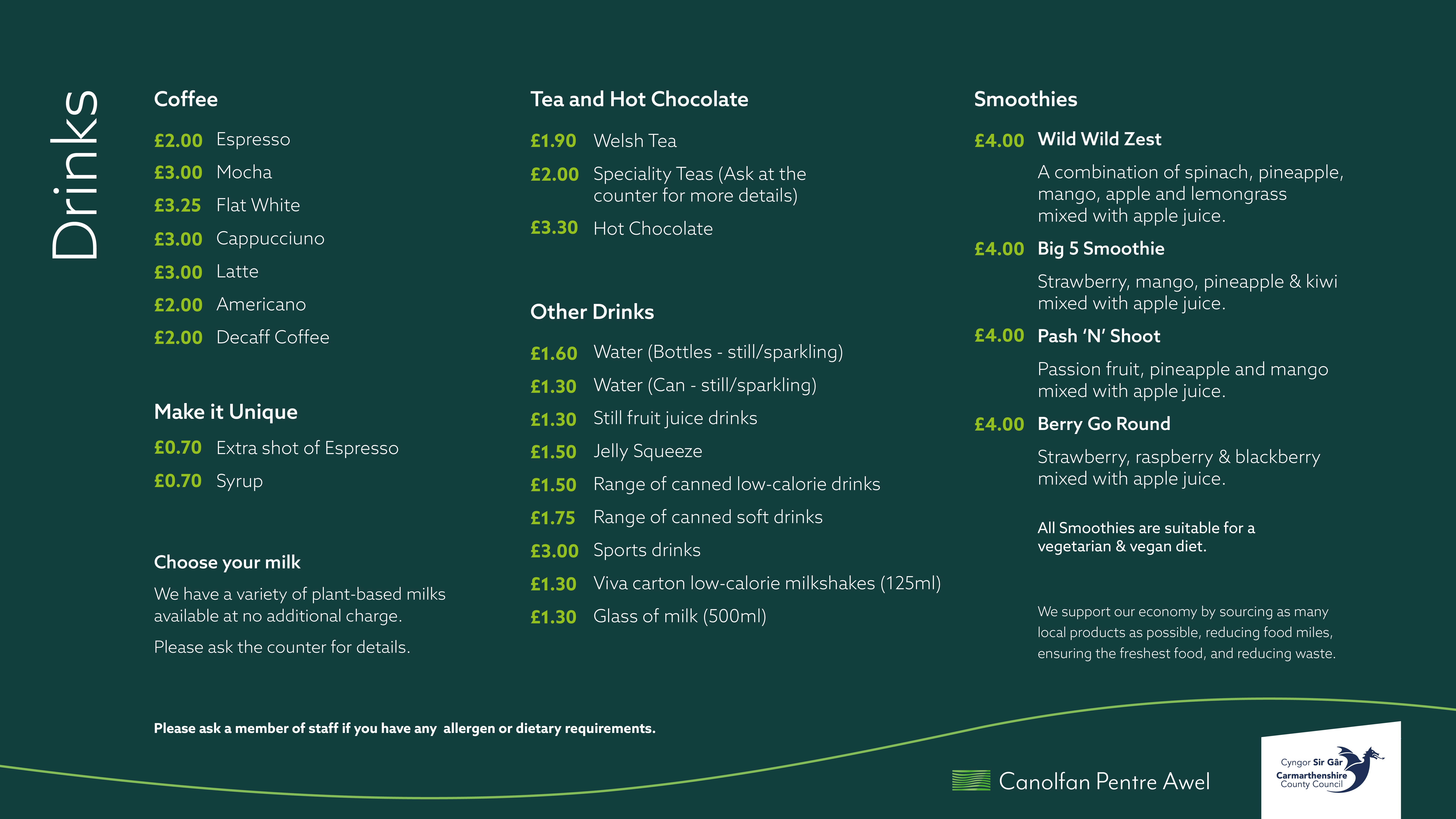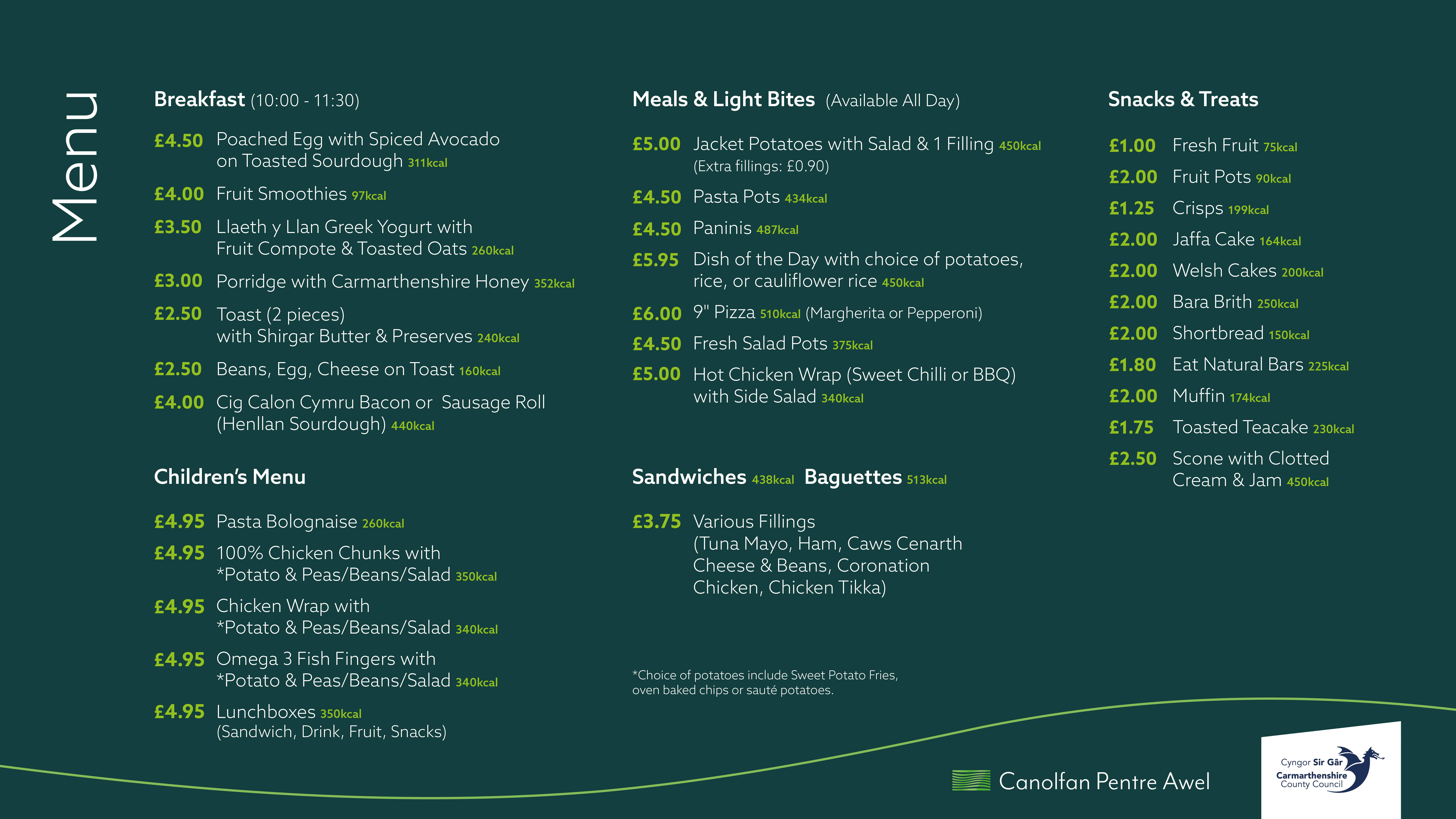 The café at Canolfan Pentre Awel offers a warm and welcoming space for visitors to relax and enjoy a selection of freshly prepared meals, snacks, and beverages. Whether you’re grabbing a quick coffee, enjoying a light lunch, or taking a break after exploring the centre, the café provides a cosy atmosphere with a menu that caters to all tastes.